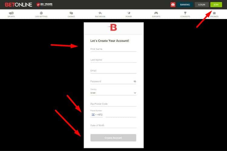 אם עברתם אל דף הבית של BetOnline לחצו על כפתור ה Join בצידו הימני העליון של המסך (ראו חץ אדום בתמונה) ותיצרו את חשבון השחקן החדש שלכם!